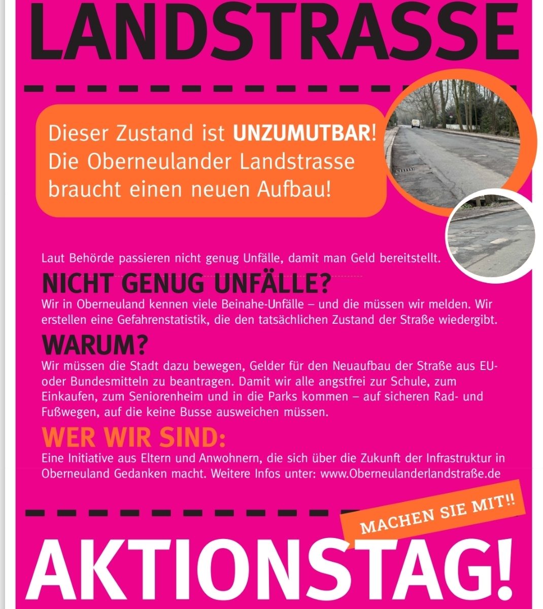 Wer sich anschließen und mit uns für eine sichere Oberneulander Landstraße kämpfen möchte, findet alle Informationen auf unserer Webseite: